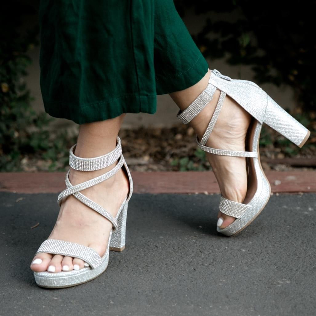 Rhinestone platform criss cross high heels that are available in 3 colors: black, silver, and champagne.